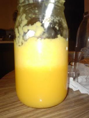 We decided to put it into a strainer, to separate the juice from the “other stuff”. We started out with four bottles of the “blended orange crap”, and now we’re left with just two bottles of actual juice.